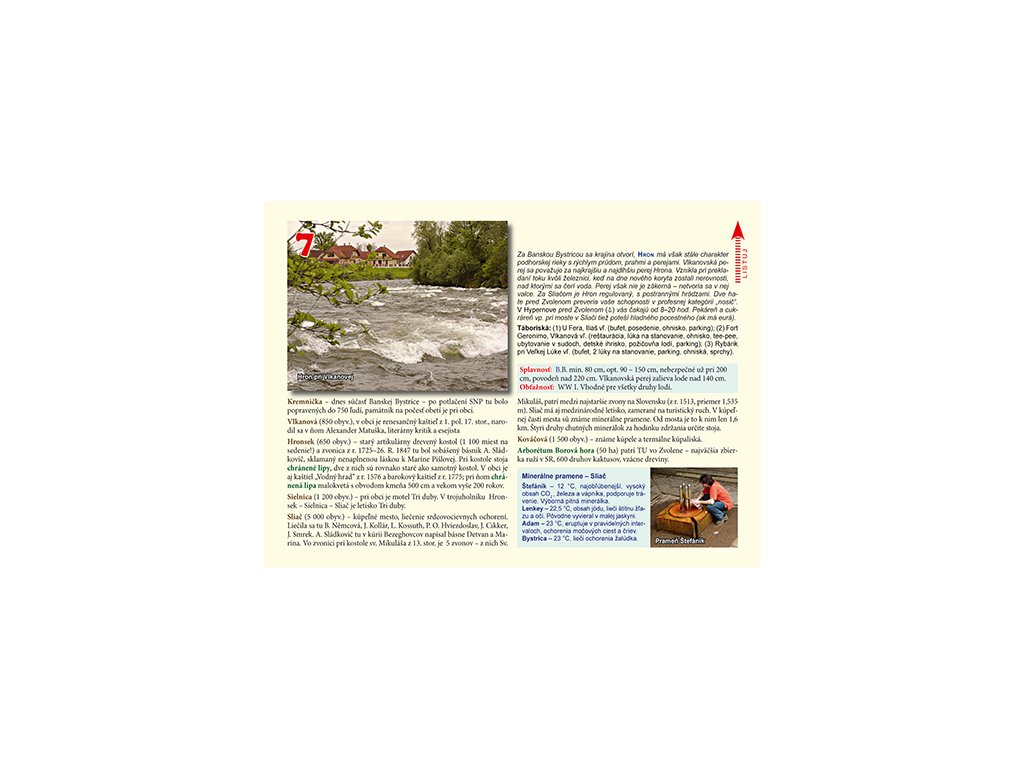 Sprievodca riekou Hron - tretie aktualizované vydanie. Po takmer polstoročí je to prvý aktuálny a komplexný sprievodca pre vodných turistov po našej najnavštevovanejšej rieke. Formát A5 so strunovou väzbou, ktorý sa krásne zmestí do lodného vaku. Sprievodca Hronom sa predáva v priehľadnom uzatvárateľnom vrecku, ktorý funguje ako ochrana proti striekajúcej vode.